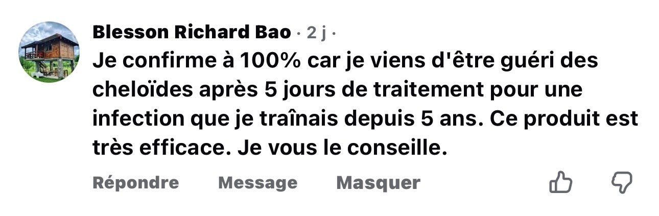 Ont confirmé que l'utilisation de notre crème a amélioré et fini vraiment et rapidement les boutons chéloïdes qu’ils avaient sur leurs nuques , derrière la tête ou autres ailleurs